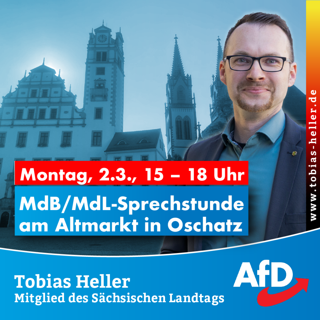 Am kommenden Montag, den 16.02.2026, findet die MdB/MdL-Sprechstunde von 15 bis 18 Uhr im AfD-Bürgerbüro Torgau in der Breiten Straße 4 statt.