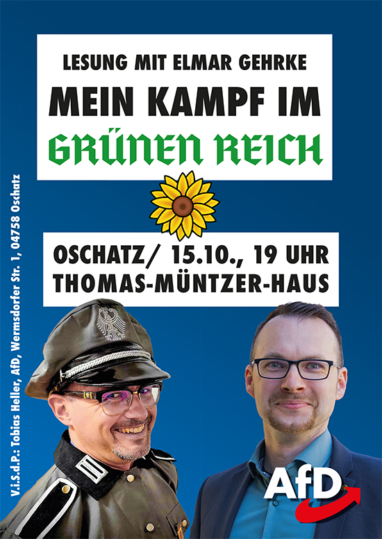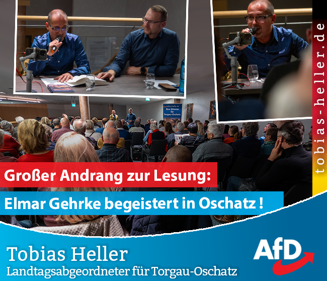 Es mussten sogar weitere Stühle organisiert werden: Rund 80 Bürger haben am gestrigen Mittwochabend dem Satiriker Elmar Gehrke im Oschatzer Thomas-Müntzer-Haus gelauscht. Gehrke las aus seinem zweiten Buch, „Mein Kampf im grünen Reich“. Die vorgelesenen Kapitel thematisierten u.a. die doppelzüngige Klima-Hysterie von Greta Thunberg und Co. den K(r)ampf gegen Rechts, die Prophezeiungen einer russischen Invasion, die eingestürzte Dresdner Carola-Brücke und weiteren Polit-Irrsinn der Gegenwart.