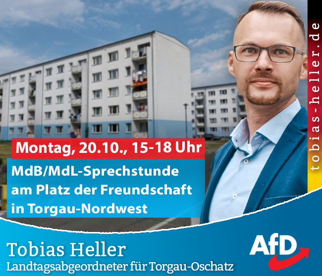 Am kommenden Montag, den 20.10.2025, findet die MdB/MdL-Sprechstunde von 15 bis 18 Uhr am Platz der Freundschaft in Torgau-Nordwest statt.