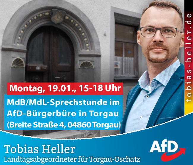 Am kommenden Montag, den 19.01.2026, findet die MdB/MdL-Sprechstunde von 15 bis 18 Uhr im AfD-Bürgerbüro Torgau in der Breiten Straße 4 statt.