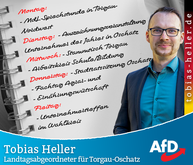Der nächste Blaue Stammtisch in Torgau mit unserem Landtagsabgeordneten Tobias Heller findet am 17. September 19 Uhr in Torgau statt.
